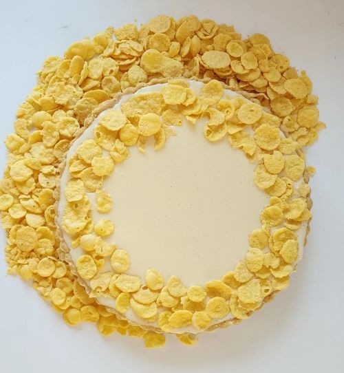 Pour over the cake and move it to the sides to cover everything, decorate with cornflakes on the sides and refrigerate for at least 5 hours before serving or overnight.